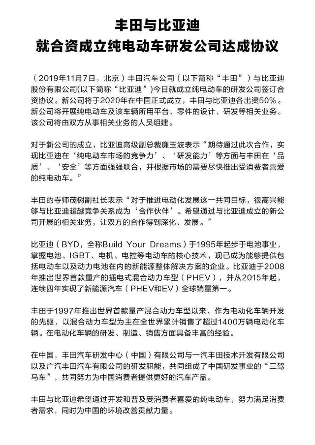 11月7日,丰田与比亚迪达成协议,双方将成立50:50合资公司,专注纯电动车的研发。该公司将由双方从事相关业务的人员组建。