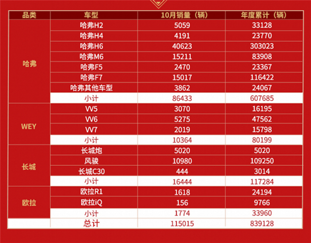 中国豪华SUV引领者WEY品牌方面,这个10月意义非凡:不仅当月销量过万,环增19%(其中WEY VV6月销5275台,同比大增三成),更是在10月22日迎来了WEY品牌的第30万台整车下线,创造了中国豪华汽车品牌的新纪录。今年1-10月,WEY品牌累计销量超8万台,相信在今年最后两个月,WEY还会继续向前,引领中国品牌持续突破向上。