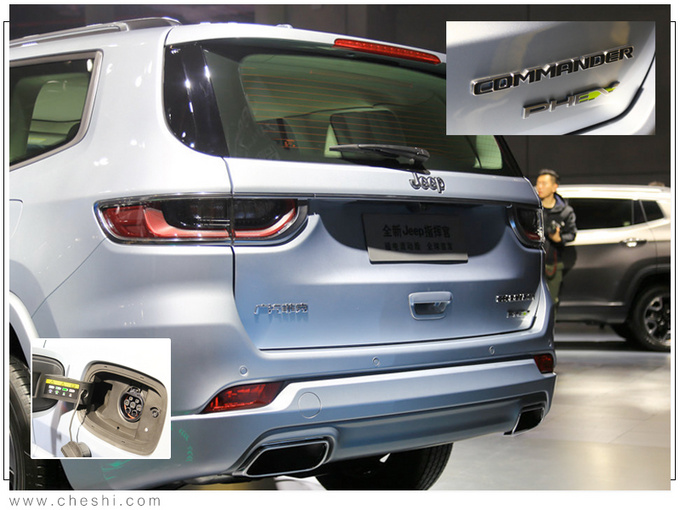 指挥官PHEV外观方面延用了汽油版车型的设计,整体造型硬朗,前脸采用Jeep家族标志性的七孔进气格栅并在内部融入银色镀铬装饰,车身左侧后翼子板处增加充电接口,车尾贴有PHEV标识,表明其新能源车型的身份。内饰方面配有7英寸液晶仪表盘与8.4英寸中控大屏,相比燃油版车型在挡杆前部加入了驾驶模式选择旋钮。