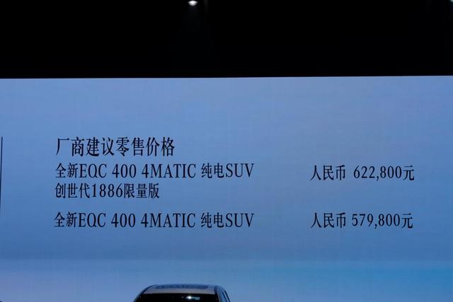 2019年11月8日,梅赛德斯-奔驰首款纯电动车型EQC在北京正式上市。新车共推出2款车型,其中EQC 400 4MATIC车型的价格为57.98万元,而基于EQC 400 4MATIC打造的创世代1886限量版则售62.28万元。此外,新车还可以享受包含1万6千元国家补贴以及6年12万公里养护套餐在内的诸多优惠。
