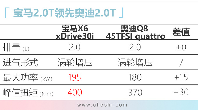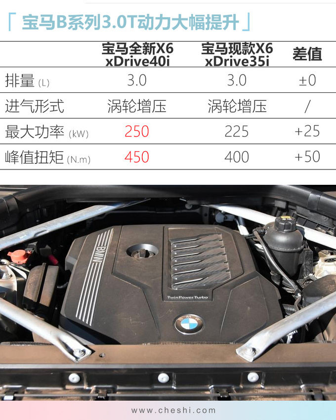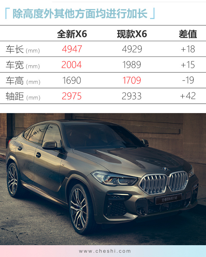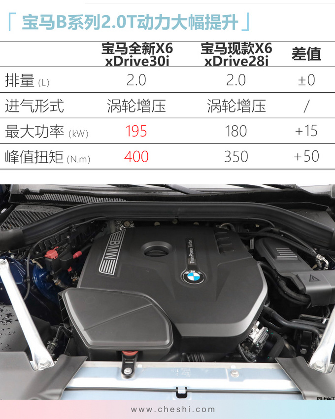 基于CLAR平台打造的宝马全新X6,除车身高度小幅降低外,其他方面都进行了加长,领先奔驰GLE Coupe,整体尺寸与奥迪Q8相当。动力方面,全新X6搭载的B系列2.0T、3.0T发动机,动力参数相比现款车型得到大幅提升。传动系统新车匹配8AT变速箱,并标配xDrive四驱系统。未来宝马还将推出全新X6 M (配置|询价)车型,新车搭载4.4T V8发动机,最大功率为441kW,峰值扭矩为750N·m,传动系统匹配M Sport 8AT变速箱。