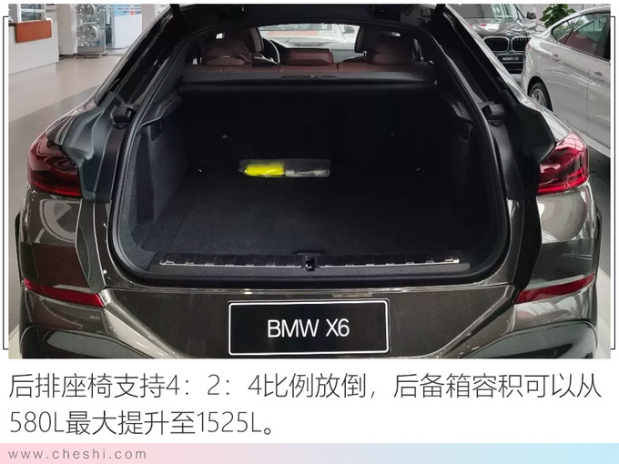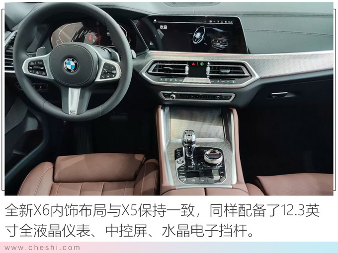 内饰方面,宝马全新X6整体设计与X5保持一致,中控台、车门等使用大量真皮包裹,同时还配备12.3英寸全液晶仪表盘、M运动方向盘、水晶电子档把以及尺寸同样为12.3英寸的中控屏幕等。新车后排座椅支持4:2:4比例放倒,后备箱容积可以从580L最大提升至1525L(与现款一致)。