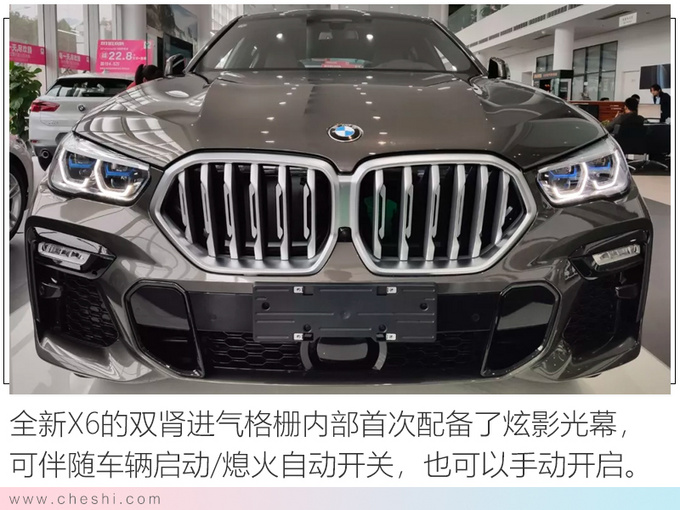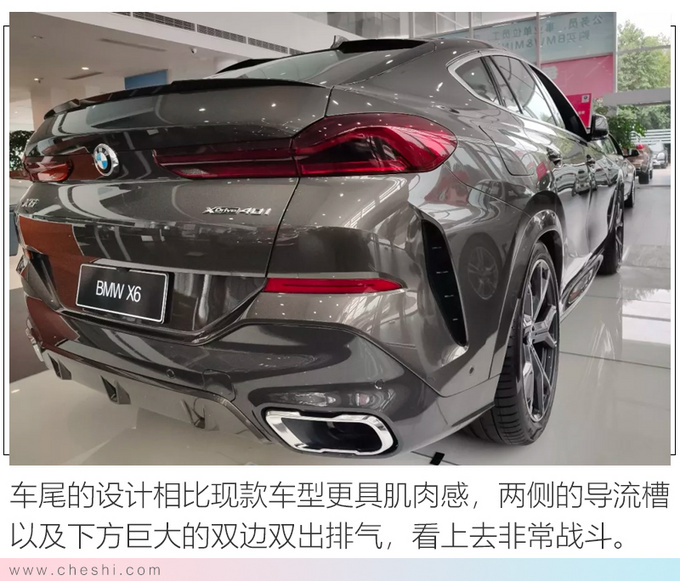 宝马全新X6 (配置|询价)外观设计相比X4 (配置|询价)更加激进,更大的车身尺寸看上相当魁梧。新车双肾形进气格栅尺寸更大,内部的炫影光幕搭配激光LED大灯,夜晚点亮后辨识度不输“灯厂”奥迪旗下的车型,保险杠两侧LED雾灯与空气导流槽融为一体。车身侧面溜背造型相较现款更加舒展,车尾配备双扰流板,修长的LED灯组也成为了宝马运动车型的标志,排气为双边共两出式布局。