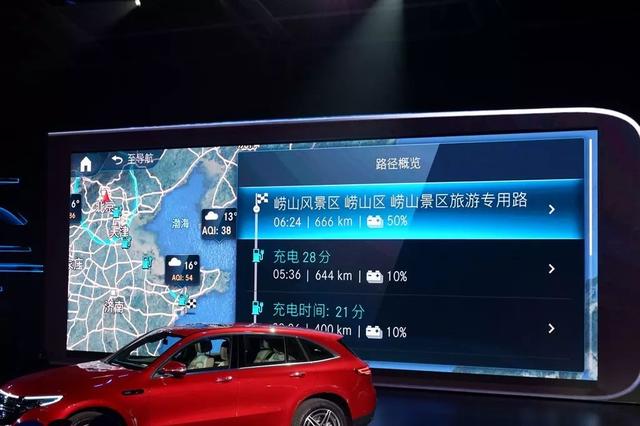 在导航方面,EQC标配的MBUX智能人机交互系统拥有针对电动车优化过的导航功能,其特点就是可以让车主在导航时设置到达目的地时电池的剩余电量,设定值在10%-50%。导航会根据设定选择沿途的充电桩为途经点,并计算出包括充电时间在内的出行时间,为出行提供更多的便利。