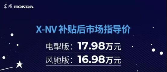 X-NV共推出两款车型,补贴后市场指导价分别为风驰版16.98万、电掣版17.98万,并同步推出回馈消费者丰富贴心的“FUN心用”政策。