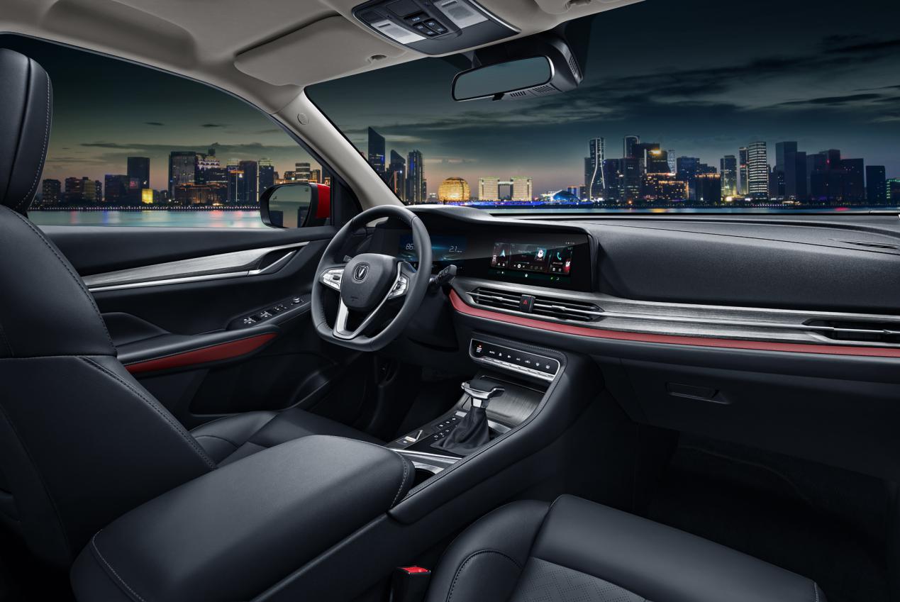 内饰方面,长安CS55PLUS座舱内采用熏黑式的整体配色,辅以精致红色装饰以及小面积的红色运动包围;双10.25英寸、1920*720高分辨率的双联屏设计重新定义车内仪表组合,极具未来基因;科技关怀设计的中控台和大屏向驾舱精确倾斜10°,配合D型多功能运动方向盘和星舰式换挡手柄造型,让驾驭变得更加得心应手。此外,“越级星空全景天窗”仅能够实现滑动和升降,更具备雨量感应自动关闭及防夹功能,时刻保证用户安全。
