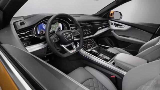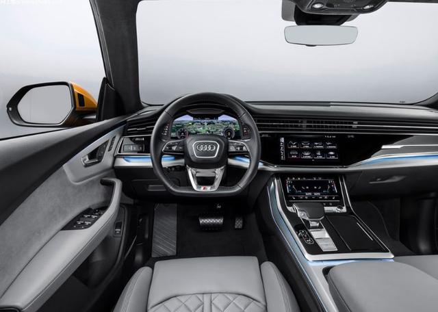 奥迪Q8既然是奥迪旗舰产品,所以在内饰设计方面跟奥迪A8旗舰车型颇为相像,例如贯穿式空调出风口、大面积烤漆装饰面板、D字形运动方向盘、一体式运动座椅、升降式B&O音响等,都凸显了档次感和豪华感。