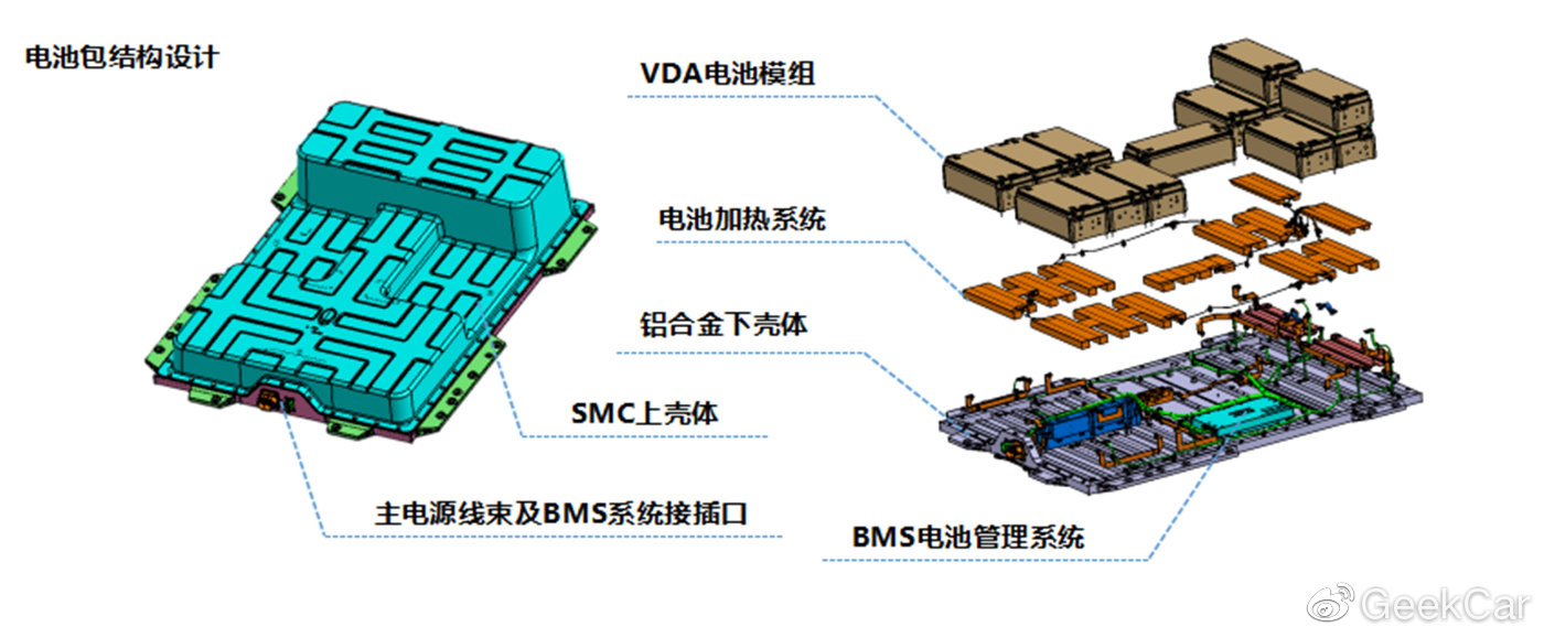 欧拉 R1 的电池包设计机构为 SMC 材质上壳体、VDA 电池模组、电池加热系统、集中式 BMS、主电源线束及 BMS 系统及插口、铝合金材质下壳体。