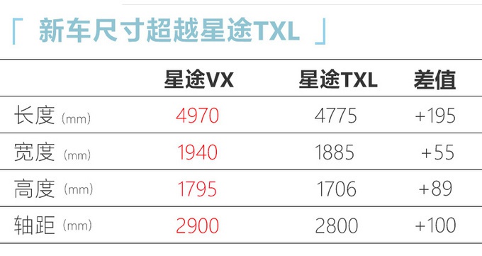 动力部分,星途VX初期会搭载奇瑞第三代1.6T发动机,最大功率145kW,百公里油耗7.9L,传动系统匹配7DCT变速箱。不过对于这种级别的SUV来说,1.6T动力也许还是无法满足部分消费者的需求。据了解,星途VX未来还将搭载奇瑞最新的ACTECO 2.0TGDI发动机,采用350 bar直喷系统,并配备双平衡轴系统,最大功率180kW,峰值扭矩380N.m。