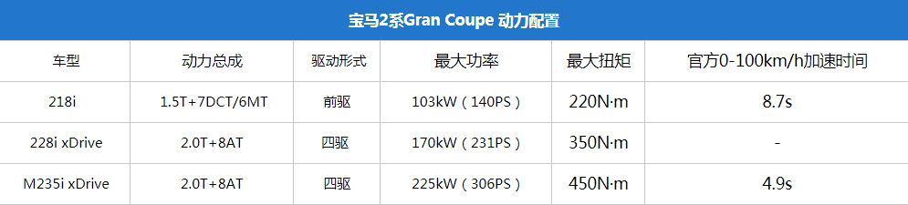 动力方面,宝马2系Gran Coupe提供多款动力,汽油版本中,218i车型搭1.5T三缸涡轮增压引擎,最大功率103kW(140PS),峰值扭矩220N·m,匹配7速双离合变速箱或6挡手动变速箱,官方0-100km/h加速8.7s;228i xDrive仅向美国市场提供,搭载2.0T四缸涡轮增压引擎,最大功率170kW(231PS),峰值扭矩350N·m,匹配8速手自一体变速箱和适时四驱系统;M235i xDrive同样搭2.0T四缸涡轮增压引擎,最大功率达到225kW(306PS),峰值扭矩450N·m,匹配8速手自一体变速箱和适时四驱系统,官方0-100km/h加速时间4.9s。(文:太平洋汽车网 李升鸿)