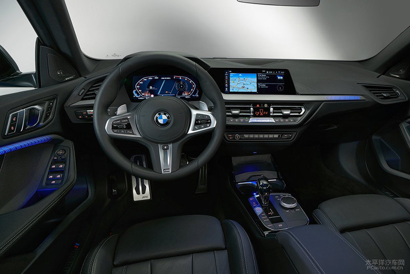 该车内饰的设计与新一代1系两厢一致,配备了宝马最新款式的全液晶仪表盘、电子挡把、方向盘、中控屏等。中控屏幕内置宝马iD7人机交互系统,车门门板、副驾中控面板和挡把区域还加入了氛围灯,提升了内饰的情调。官图中展示的是M235i xDrive车型的内饰,配有带换挡拨片的M方向盘、铝合金脚踏板和运动桶形座椅。