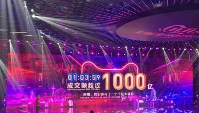 1小时3分59秒,天猫成交额突破1000亿大关,比2018年快了43分27秒。