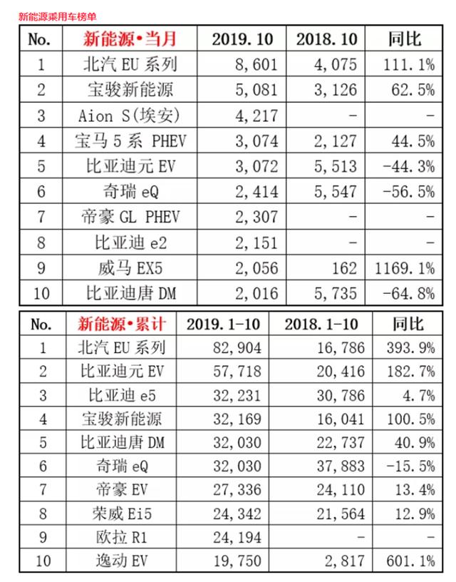 综合新能源车销量详细数据看,1-10月累计销量排名前10的车型为北汽EU系列、比亚迪元EV、比亚迪e5、宝骏新能源、比亚迪唐DM (配置|询价)、奇瑞eQ、帝豪 (配置|询价)EV、荣威Ei5、欧拉R1、逸动EV,已连续3月没变化。且排名前6款车型已连续4月没发生变化,稳定趋势进一步加强。