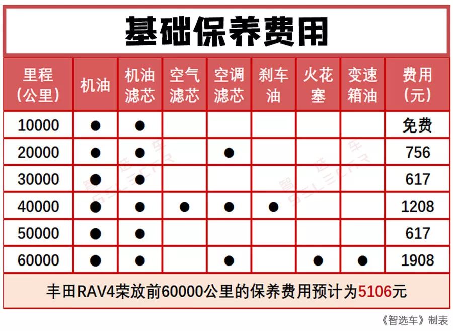 最终按照官方保养周期和保养项目,新款丰田RAV4荣放的2.0L和2.5L混动前6万公里预计花费5106元进行常规保养。这样的保养费用在同级别中属于较好的水平,另外10000公里的保养间隔也减少了车主进出4S店的频次,节约的时间也是一种无形的成本优势。