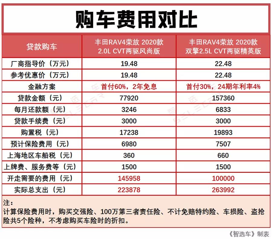 11月份,一汽丰田仅为全新RAV4荣放的2.0L车型提供了“首付60%,2年免息”的贷款政策。如果购买2.5L混动车型,小智咨询的4S店可以提供“首付30%,24期年利率4%”的贷款方案。最终由于贷款方案的不同、以及保险和车船税方面的差别,2020款丰田RAV4荣放2.0L CVT两驱风尚版和双擎2.5L CVT两驱精英版的购车总支出相差了4万元左右,差价还是相当可观的。