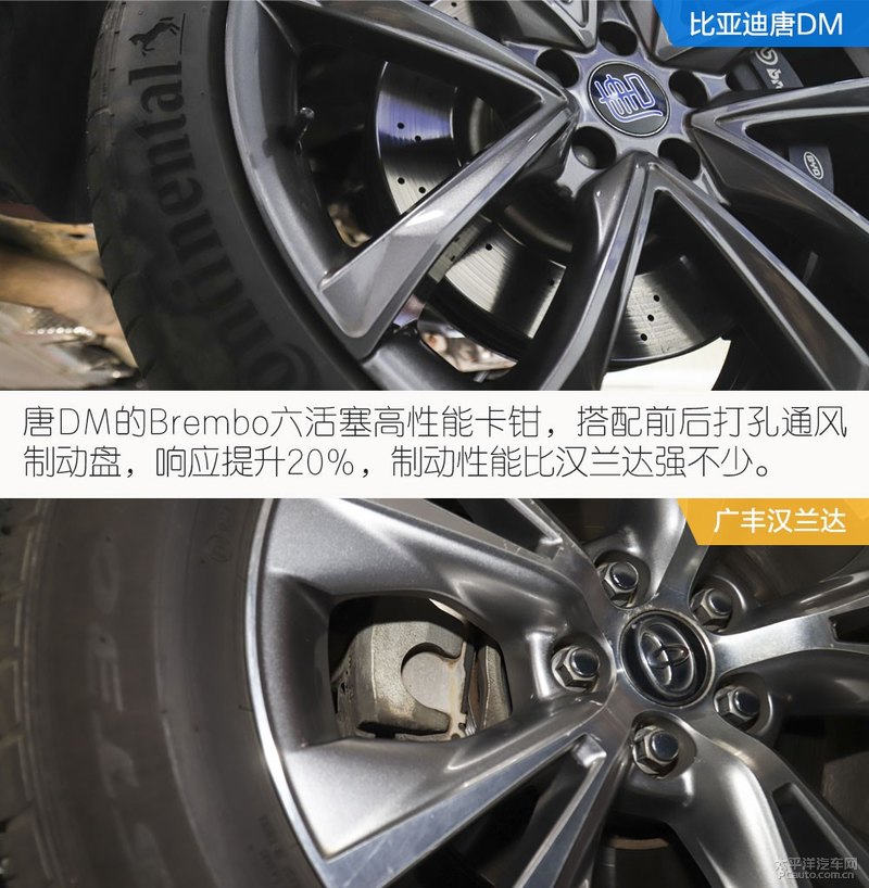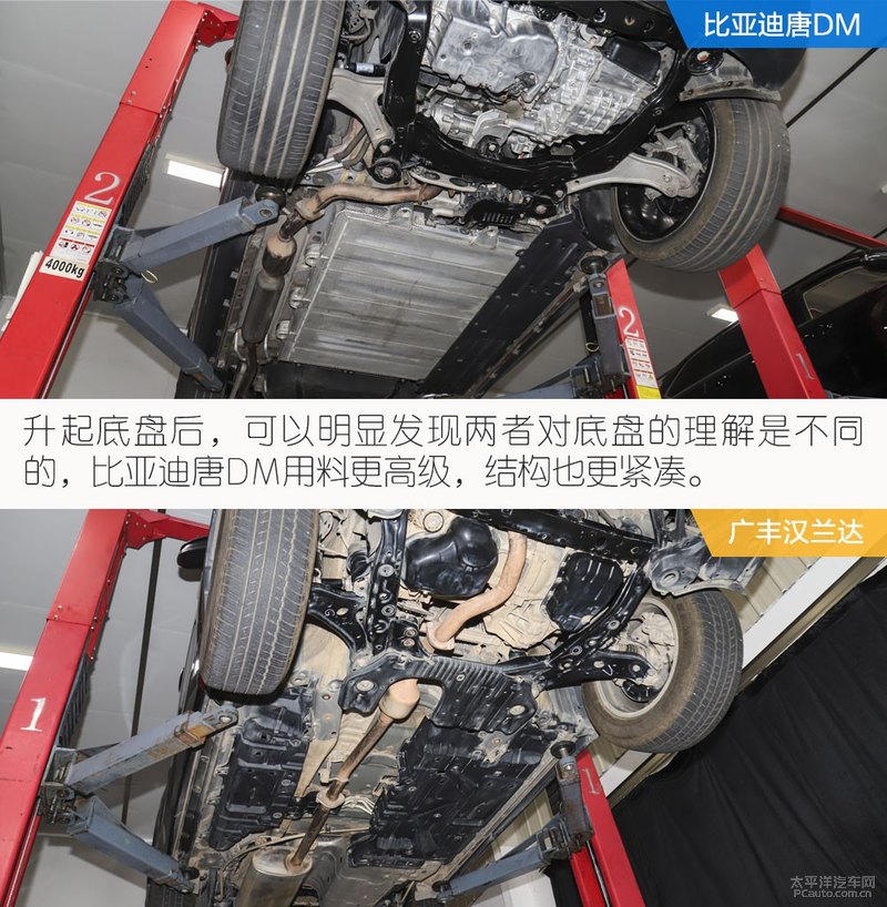 有趣的是,全新一代比亚迪唐DM把假想敌想象为价格相近的丰田汉兰达 (配置|询价),并把它拉到现场并升起底盘比比。升起后,总览两个底盘结构,前面是熟悉的麦弗逊式独立悬架。不过可以发现比亚迪全新一代唐 (配置|询价)DM的底盘轻量化下足了工夫,下摆臂、车轮轴承座以及副车架(高配)已经变为了铝合金,簧下质量更轻,这对操控都是有极其明显的帮助。配合锻造转向节,而汉兰达的轻量化和底盘防护层面做的比较一般,钢制部件较多,护板覆盖较少。
