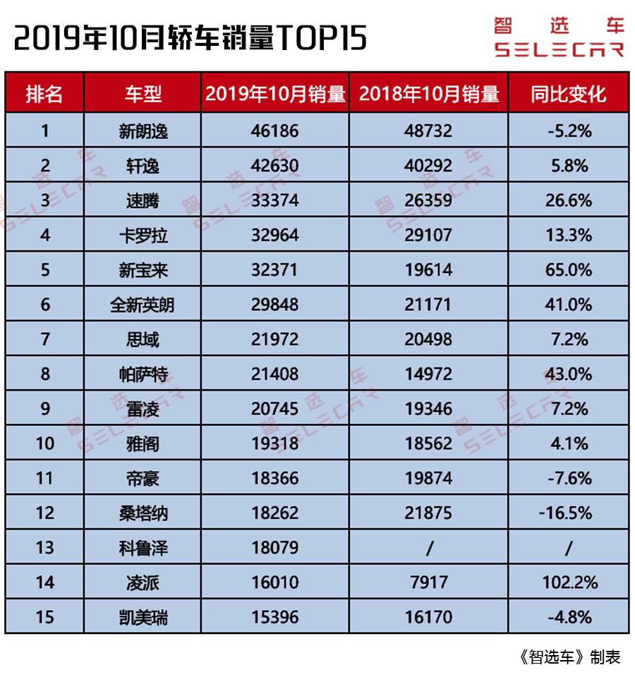 附上2019年9月份轿车销量前15名: