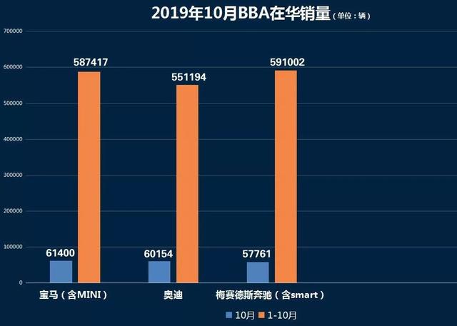 时间来到2019年后,BBA的冠军争夺战也没有停下来的意思。而随着各大品牌数据的出炉,BBA在今年1-10月的销量情况也跃然眼前。粗略一看,包含了smart的奔驰和包含了MINI的宝马分列一二名,而奥迪则掉队至第三,与第一名的奔驰大概有4万台的差距。