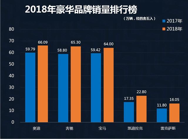 数据显示,2018年BBA三方的销量基本已在同一水平线:奥迪品牌以66.0888万辆的数字保住了销量榜单第一位,奔驰品牌则以65.2996万辆的全年销量惜败对手成为第二,宝马要稍逊色一些,在包含MINI的情况下,销量为63.9953万辆。就总量而言,三者差距不大,完全可以称之为“三足鼎立”。