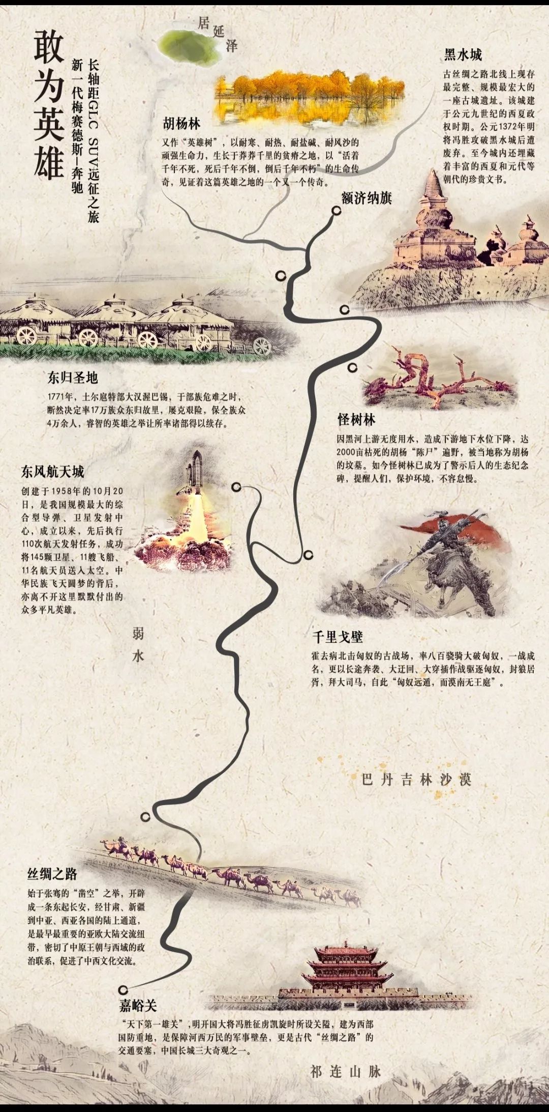 不得不说,有了“智勇双全”的新一代长轴距GLC SUV陪伴,使得整个征途更像是一次完美的旅途。在追寻英雄足迹、穿越崎岖戈壁、探访黑城遗址的诸多有趣环节过程中,笔者及同行媒体无不能深刻感受到新一代长轴距GLC SUV天地从容的英雄气概。