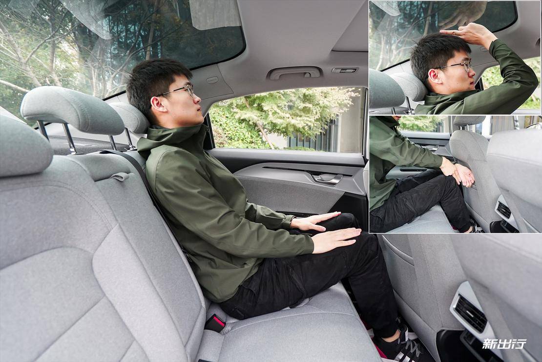 随着电池容量的加大几何 A 长续航版的乘坐空间是否有变化?身高 178cm 的我将前排座椅调整最低,此时我的头部空间还有一掌左右;保持前排座椅不同的情况下去到后排,此时后排头部空间还有两指左右,腿部空间也还有 1 拳 2 指左右,相比于 400km 的版本是没有变化的。