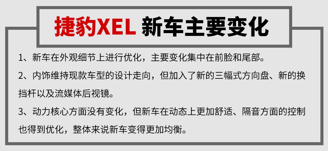 面对激烈的豪华汽车市场,捷豹根据大部分消费者的需求进行多重优化,让中期改款的捷豹XEL变得更加均衡了。几处设计改动,让新车更加新潮个性;内饰诸多变化,比如全新的三幅式方向盘、换挡杆以及车机系统等等,再加上流媒体的科技配备,新车在便利性有了更大程度的提升。而在动态方面,新车在操控与舒适找到一个更加平衡的临界点。