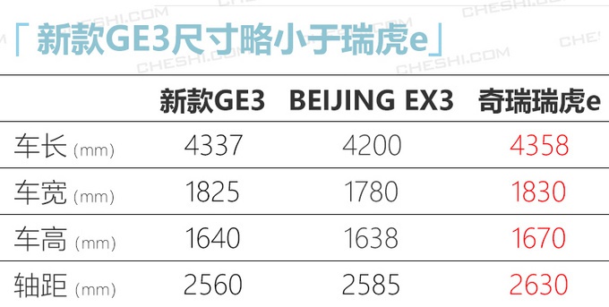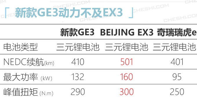在车身尺寸方面,广汽新能源并未公布新款GE3 530的相应数据,预计与老款车型保持一致,老款GE3长宽高分别为4337×1825×1640mm,轴距为2560mm,与BEIJING EX3和奇瑞新能源瑞虎e两款竞品相比,尺寸数据介于两者之间。在动力方面,新款GE3搭载的电池系统能量密度为160Wh/kg,NEDC工况续航里程为410km,电池容量为48.39kWh,百公里电耗为13.6kWh/100km。