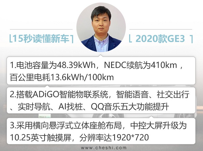 广汽新能源2020款GE3 530(以下简称新款GE3)正式上市,新车分为乐享版、互联网悦享版、互联网尊享版3个版本,补贴后售价分别为12.98万元、13.58万元、15.58万元。新车相对于2018款车型,配置上增加了行李架,10.25英寸中控触摸屏替代了老款8寸中控屏。同时,2020款GE3 530为用户提供了“半价提车、3年0息”、“10万定额贷,2年0息、3年超低息”等购车金融政策。